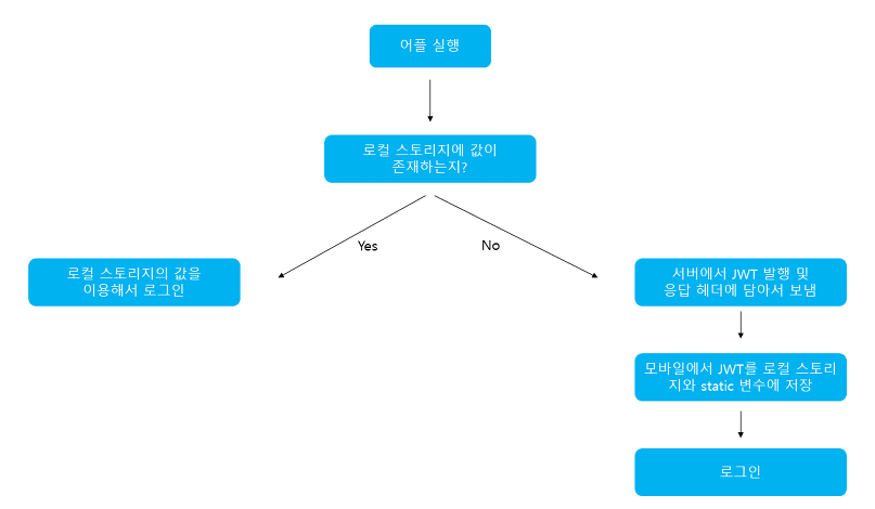 애플리케이션이 실행될 때, JWT를 static 변수와 로컬 스토리지에 저장하게 된다. static 변수에 저장되는 이유는 HTTP 통신을 할 때마다 JWT를 HTTP 헤더에 담아서 보내야 하는데, 이를 로컬 스토리지에서 계속 불러오면 오버헤드가 발생하기 때문이다. 클라이언트에서 JWT를 포함해 요청을 보내면 서버는 허가된 JWT인지를 검사한다. 또한 로그아웃을 할 경우 로컬 스토리지에 저장된 JWT 데이터를 제거한다. (실제 서비스의 경우에는 로그아웃 시, 사용했던 토큰을 blacklist라는 DB 테이블에 넣어 해당 토큰의 접근을 막는 작업을 해주어야 한다.)