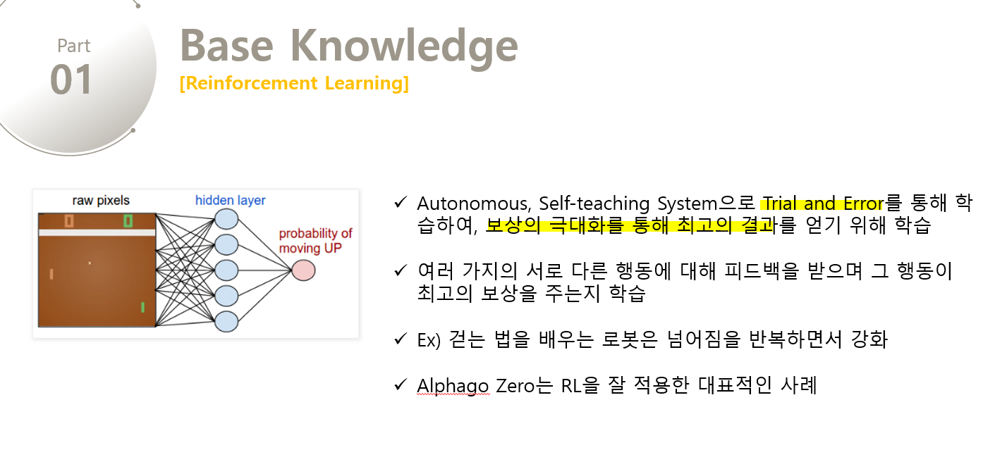 Reinforcement Learning은 시도와 실패(Trial and Error)를 통해 학습하는 autonomous, self-teaching system이다. 이것은 보상의 극대화에 초점을 두고 행동하며, 최상의 결과를 얻기 위해 학습한다. 이것은 우리가 자전거를 타는 법을 배우는 것과 유사하다. 여러번 시도하고 넘어지며 타는 법을 학습하다가, 자전거를 잘 타게된다. 강화학습 역시 여러 가지의 서로 다른 행동을 취하며 결과에 대한 피드백을 받으며 해당 행위가 최고의 보상을 주는지 학습한다. 그리고 항상 최고의 결과를 내기 전까지 수많은 학습을 통해 알고리즘을 수정하고 변형하며 강화한다. RL을 사용한 좋은 예시가 걷는 방법을 학습하는 로봇이다. 로봇은 먼저 크게 앞 뒤로 걸음을 내딛는다. 하지만 큰 걸음으로 걷지 못하게 되며, 넘어지게 된다. 하지만 이러한 실패라는 결과는 점차 걷는 크기를 줄이게 되는 데이터에 해당하고, 이러한 과정을 반복하면서 점차 걷게된다. 강화학습이 적용된 또 다른 유명 사례 중 하나가 Google의 Deep Mind가 고전적인 Atari 게임에 RL을 적용한 것이다. 목표는 점수를 최대화하기 위한 것이고, 화면 하단에 있는 막대를 움직여 화면 위로 벽돌을 깨기 위해 공을 다시 튀기게한다. 처음에는 많은 실패를 겪지만, 결국에는 최고의 인간 플레이어를 이기게 된다.
