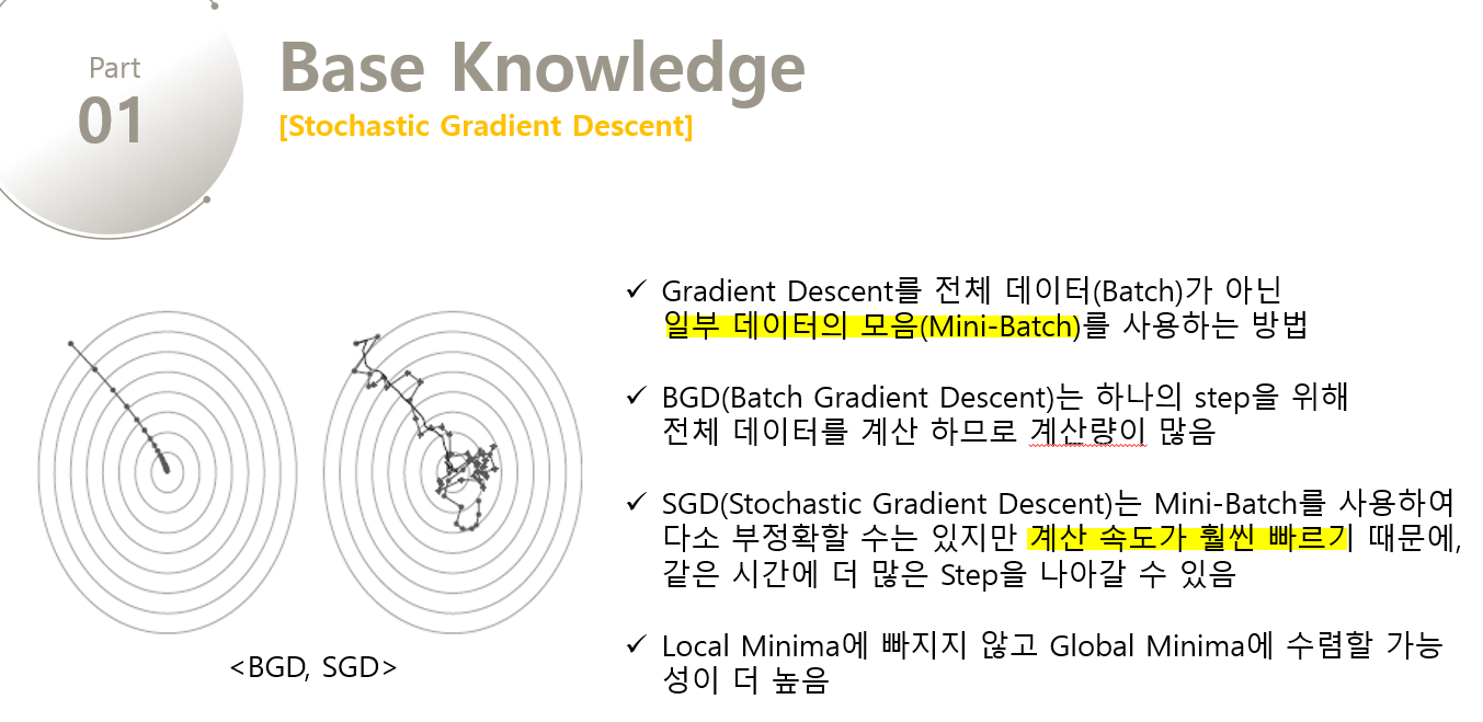 여기서 Loss Function을 계산할 때 전체 Train-Set을 사용하는 것을 Batch Gradient Descent라고 한다. 그러나 이렇게 계산하면 한번 step을 내딛을 때, 전체 데이터에 대해 Loss Function을 계산해야 하므로 너무 많은 계산양을 필요로 한다. 이를 방지하기 위해 보통은 Stochastic Gradient Desenct(SGD)라는 방법을 사용한다. 이 방법에서는 Loss Function을 계산할 때, 전체 데이터(Batch) 대신 일부 데이터의 모음(Mini-Batch)를 사용하여 Loss Function을 계산한다. Batch Gradient Descent보다 다소 부정확할 수는 있지만, 계산 속도가 훨씬 빠르기 때문에 같은 시간에 더 많은 step을 갈 수 있으며, 여러 번 반복할 경우 Batch 처리한 결과로 수렴한다. 또한 Batch Gradient Descent에서 빠질 Local Minima에 빠지지 않고 더 좋은 방향으로 수렴할 가능성도 높다. 여기에 더해 SGD를 변형시킨 여러 알고리즘들을 활용하면 훨씬 좋은 성능을 낼 수 있고, 변형된 알고리즘으로 Naive Stochastic Gradient Descent 알고리즘이고, Momentum, NAG, Adagrad, AdaDelta, RMSprop 등이 있다.