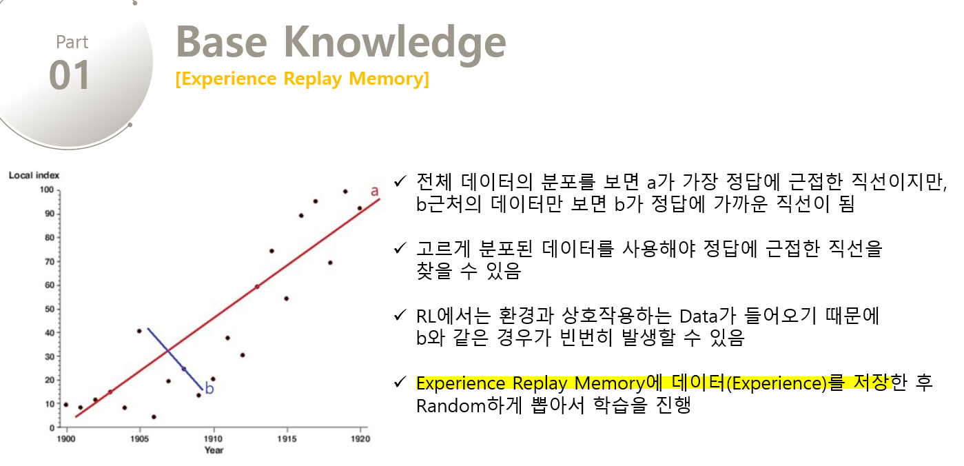 머신러닝에서 학습 데이터가 아래와 같다고 하자. 전체 데이터의 분포를 보면 a가 정답에 가장 근접한 직선이지만, b근처의 데이터만으로 학습을 진행한다고 하면 b가 정답에 가장 가까운 직선이 된다. 이를 통해 고르게 분포된 데이터를 사용해야 정답에 근접한 직선을 찾을 수 있음을 알 수 있다. 하지만 DL은 data와 label이 존재하기 때문에 random하게 데이터를 추출하여 correlation을 줄일 수 있지만, RL은 환경과 상호작용하는 data가 들어오기 때문에 b처럼 correlated 되는 데이터가 학습될 수 있습니다. 이를 해결하기 위해 거대한 Experience Replay Memory를 만들고 데이터(Experience)를 저장한 후 랜덤하게 뽑아서 학습하였다. 이를 통해 correlated가 적고 고르게 분포된 데이터로 학습이 가능하다.