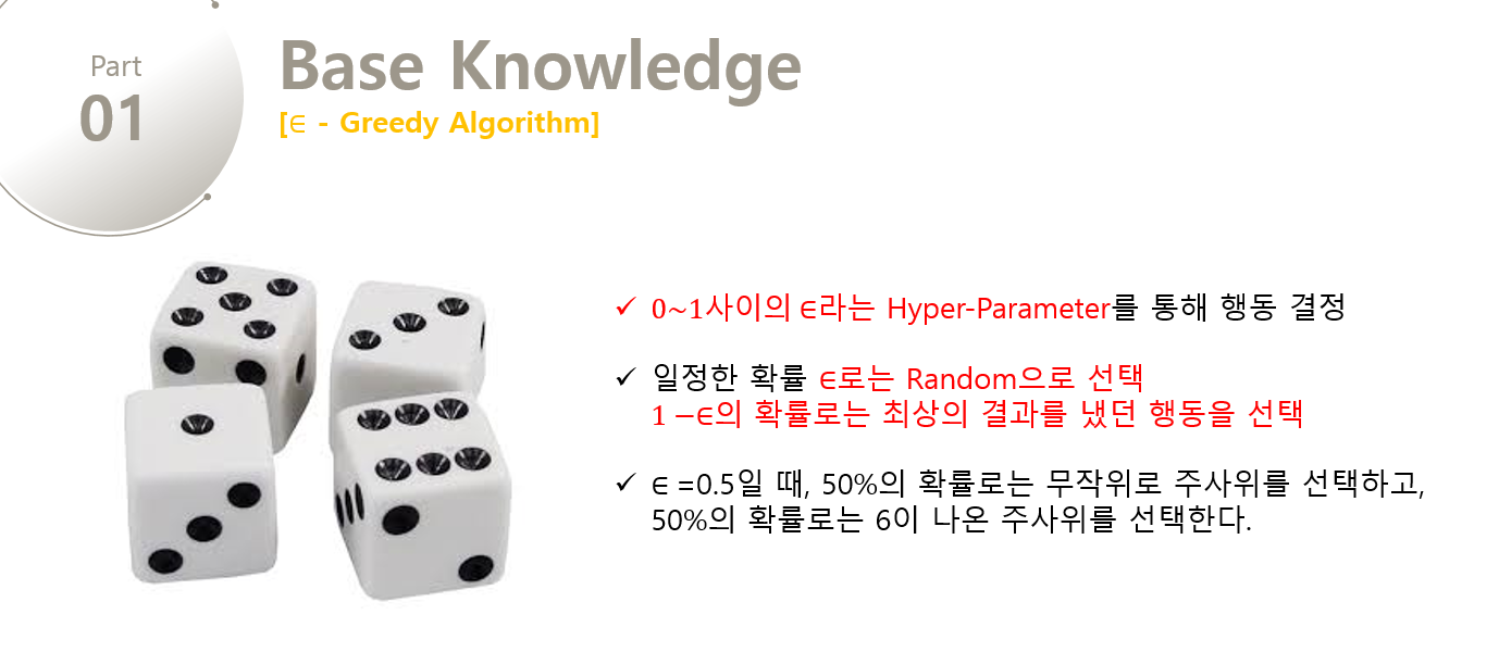 탐험이 부족했던 Greedy Algorithm을 개선시킨 전략으로, 일정한 확률로 랜덤으로 주사위를 선택하도록 하는 것이다. 예를 들어 일정한 확률을 위한 도구로 동전을 사용한다고 할 때, 동전의 앞면이 나오면 랜덤으로 주사위를 선택하고 동전의 뒷면이 나오면 이전에 최선의 결과를 냈던 주사위를 선택하는 것이다. 이러한 알고리즘은 Epsilon-Greedy(E-Greedy) 알고리즘이라고 부르며, 판단을 위해 사용된 동전의 앞면이 나올 확률 50%는 Epsilon이라는 HyperParameter가 된다. Epsilon이라는 HyperParameter는 0~1 사이의 변수로, 위의 예제에서는 e가 0.5에 해당되며 50%의 확률로는 주사위 6을 선택하고, 50%의 확률로는 무작위로 주사위를 선택하게 된다.