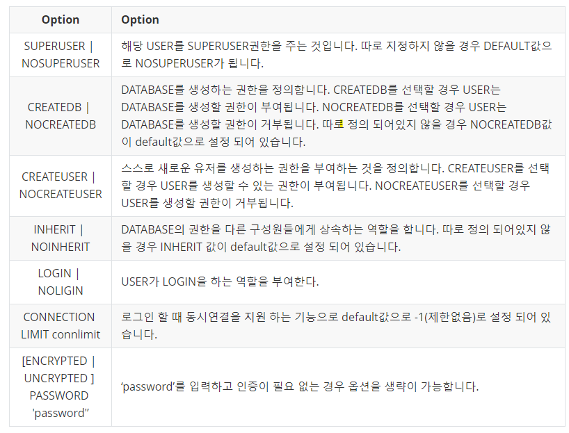 일반적으로 template1에는 인코딩이나 로케일 등과 같은 설정들을 해주고, 템플릿을 복사하여 데이터베이스를 생성한다. 그리고 template0을 통해서는 새로운 인코딩 및 로케일 설정을 지정할 수 있다.