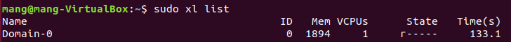 설치한 Xen 하이퍼바이저가 잘 실행되고 있는지 확인한다. 정상적으로 Xen이 설치되었다면 아래와 같은 도메인 0 가상머신이 생성되어 있을 것이다. 앞에서 도메인 0은 특권 명령을 일임하여 처리하는 가상 머신이라고 설명하였다,