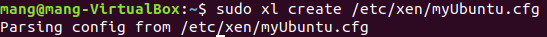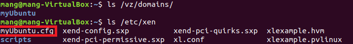 위의 명령어가 끝나면 아래은 명령어로 생성된 가상머신의 이미지를 확인할 수 있다. 위에서 우리가 hostname을 myUbuntu로 설정했기 때문에 myUbuntu라는 가상 머신 이미지가 생성되었다. 또한 /etc/xen에는 myUbuntu.cfg라는 설정 파일이 존재한다.