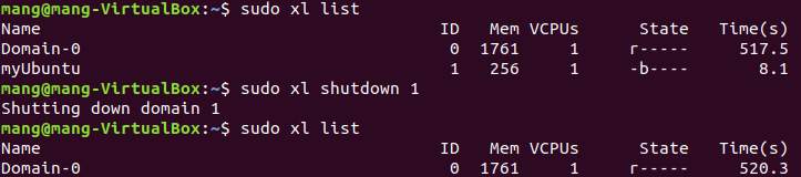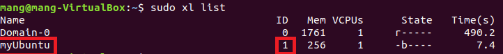 아래와 같은 명령어를 활용하면 생성된 가상머신의 정보를 확인할 수 있다. 이전과는 다르게 우리가 추가한 myUbuntu가 보임을 확인할 수 있다. 여기서 우리가 생성한 가상머신의 ID가 1임을 확인해두자. 가상머신의 ID는 가상머신의 접속 및 삭제에 사용된다.