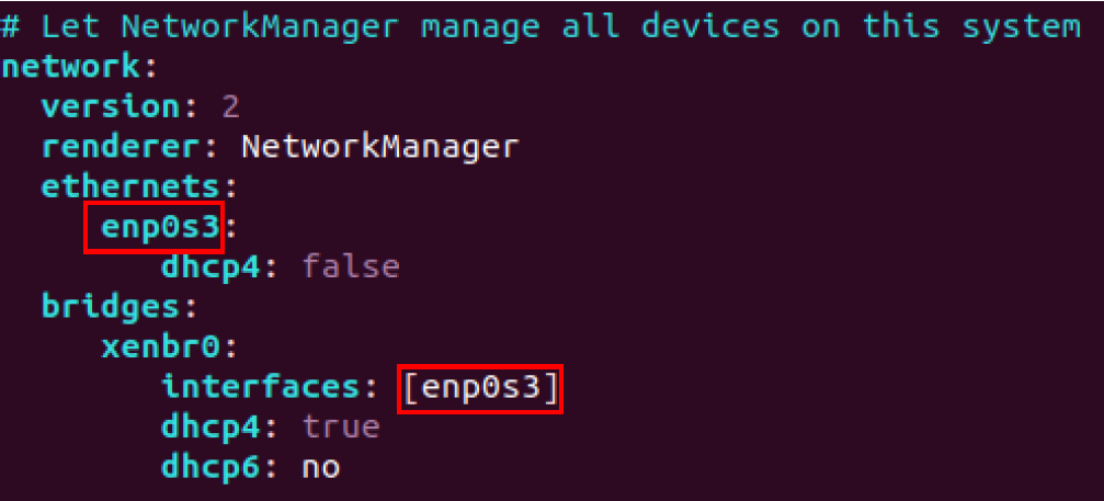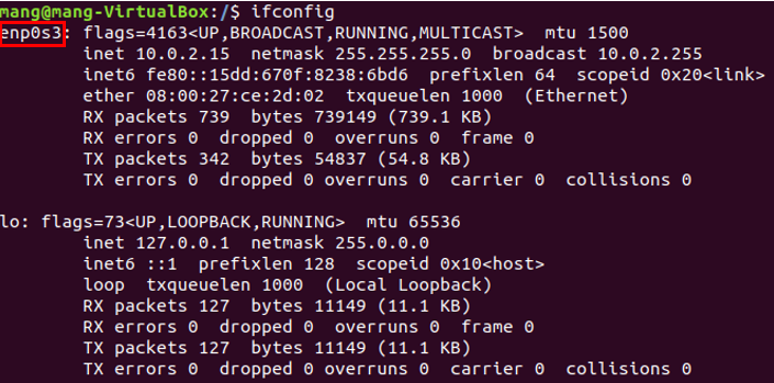 먼저 Bridge와 연결될 네트워크 인터페이스의 이름을 확인한다. 아래의 그림을 통해 우리가 설정할 네트워크 인터페이스의 이름은 enp0s3임을 확인해두자.