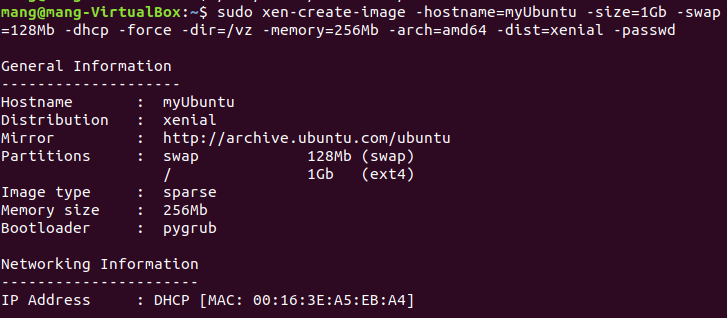 sudo xen-create-image -hostname=myUbuntu -size=1Gb -swap=128Mb -dhcp