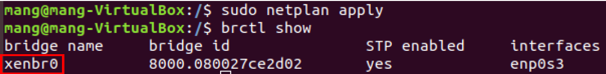 네트워크를 적용하고 설정이 잘 되었는지 확인한다. 제대로 설정되었다면 위에서 추가한 xenbr0이 보일 것이다.