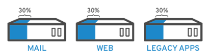 예를 들어, 용도가 다른 3개의 물리 서버가 있다고 가정하자. 1개는 메일서버이고, 다른 1개는 웹 서버이고, 다른 1개는 내무 레거시 애플리케이션을 실행하는 서버이다. 각 서버는 잠재적인 실행 용량의 30%만 사용되고 있지만, 내부 운영을 위해 레거시 애플리케이션이 계속 필요하므로, 레거시 애플리케이션과 이를 호스팅하는 또 다른 3번째 서버를 유지해야 한다.