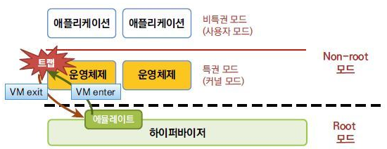 - 게스트 OS는 트랩 상태(trap state)로 바뀌게 되고, 트랩 핸들러는 VM exit를 통해 제어권을 VMM(Hypervisor)로 넘겨준다.