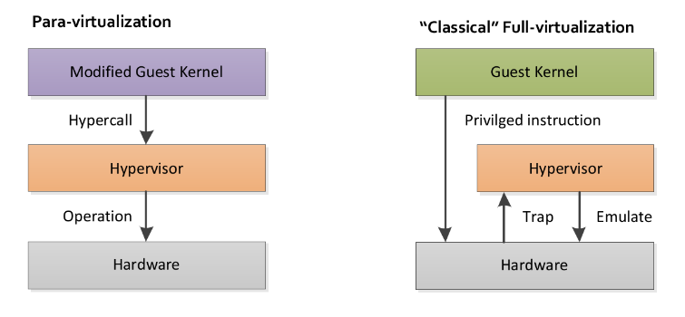 VMware가 선보인 이진 변환이라는 기술과 다르게 Xen은 Hypercall이라는 방법을 제안하였는데, 반가상화라는 대비되는 명칭을 갖게 되었다.