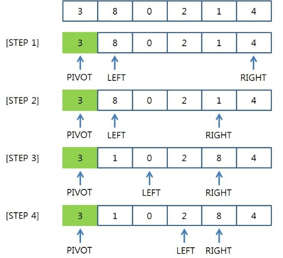 퀵소트는 매우 빠른 정렬 속도를 자랑하는 분할 정복 알고리즘 중 하나로 합병정렬과 달리 리스트를 비균등하게 분할합니다. 피봇을 설정하고 피봇보다 큰값과 작은값으로 분할하여 정렬을 합니다. 시간복잡도는 $O(nlog_2n)$ 이며 리스트가 계속해서 불균등하게 나눠지는 경우 시간복잡도가 $O(n^2)$ 까지 나빠질 수 있습니다.