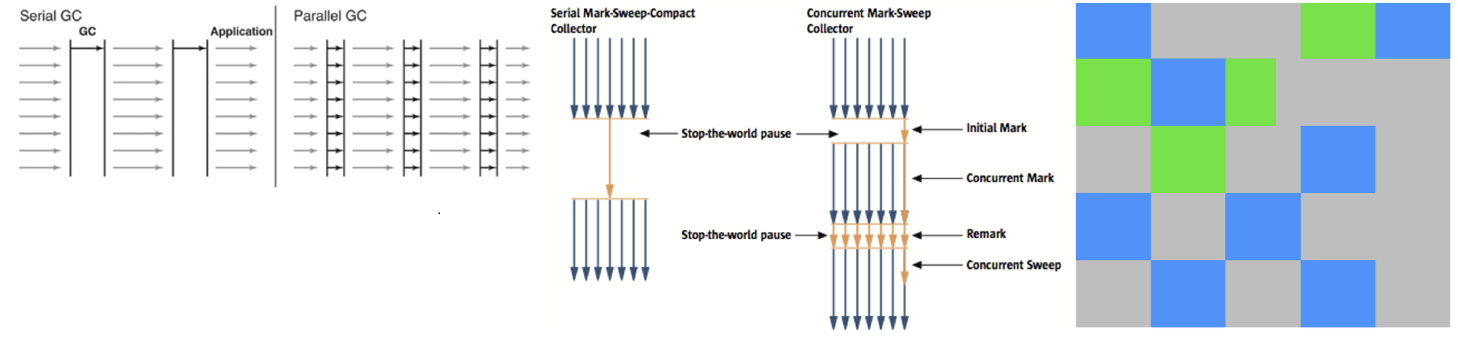 - Parallel Old GC(Parallel Compacting GC): Serial GC의 Sweep 알고리즘 대신 Summary를 사용한다. Summary 단계는 앞서 GC를 수행한 영역에 대해서 별도로 살아있는 객체를 식별하며, Sweep보다 조금 더 복잡하다.