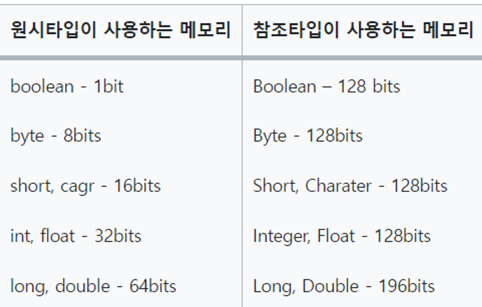즉, 원시 타입은 스택 영역에 생성되지만, 참조 타입은 힙 영역에 생성됩니다. 또한 원시 타입의 경우 메모리를 훨씬 적게 사용합니다. boolean은 1비트, byte는 8비트, short는 16비트, int는 32비트를 사용합니다. 그 외에도 원시 타입은 실제 값을 저장하기 때문에 null을 담을 수가 없습니다.